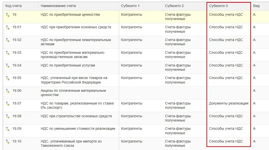 Дополнительное субконто к счету 19